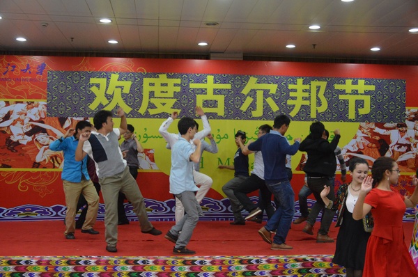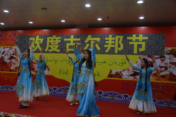 学校清真餐厅还为同学们准备了地道的新疆风味美食,大家边吃边表演节目,在歌声、舞蹈中欢度古尔邦节。热情的维吾尔族、哈萨克族、回族姑娘,用各具特色的民族歌曲与舞蹈,表达了喜悦与感激之情;冬不拉乐曲弹奏则散发着浓郁的民族气息和异域风情,用雄浑激昂或低回婉转的琴声向大家讲述美丽的民间传说;参加庆祝活动的留学生,同样以热烈的舞姿和饱满的热情给所有人留下深刻的印象。晚会现场热闹非凡、高潮迭起,随着一曲曲音乐的响起,新疆少数民族同学和留学生不断舞动,并邀请在场的老师们一起翩翩起舞。
