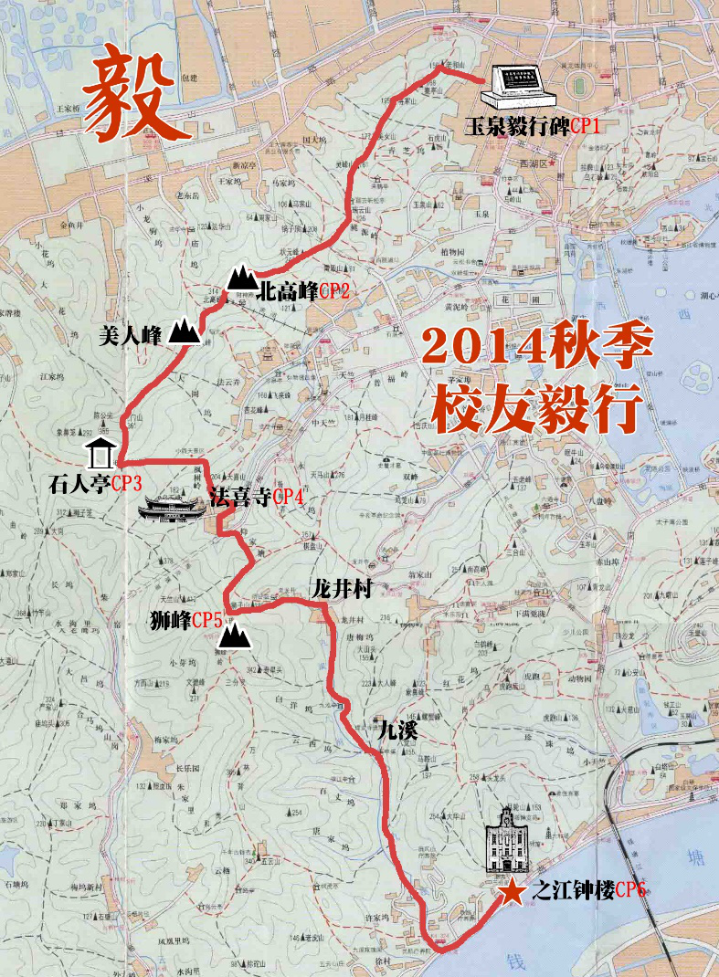 本次毅行以浙江大学玉泉校区毅行纪念碑为起点,沿途经过“老和山—北高峰—美人峰—石人亭—法喜寺—仰峰岭—龙井村—九溪十八涧—九溪路—之江路” ,最终到达之江校区钟楼。