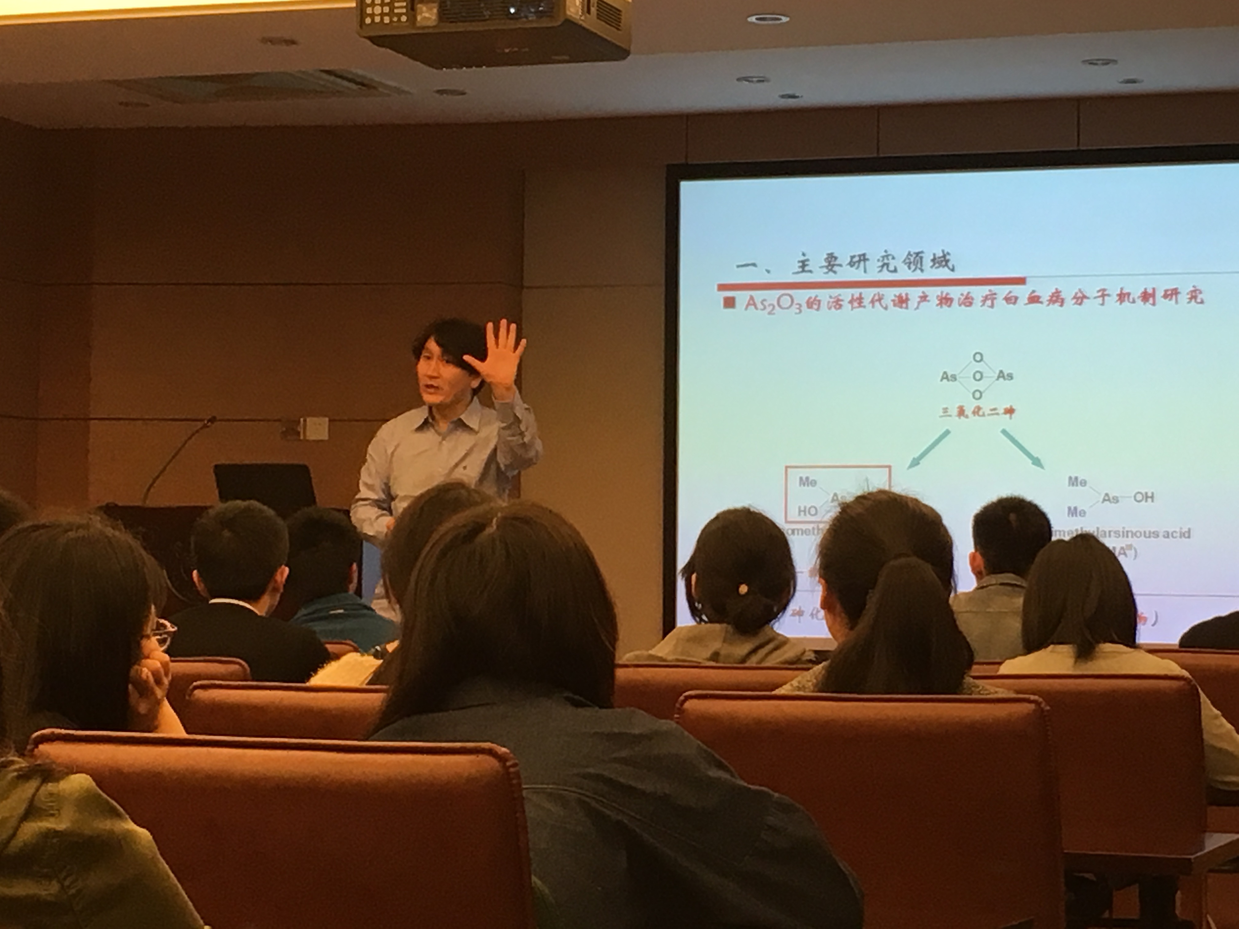 随后,那仁教授向我们介绍了他的主攻毒理学SOT(Society of Toxicology)及他最近五年主要的研究成果。主要包括:As2O3的活性代谢产物治疗m3白血病分子机制研究;首次发现砷代谢产物介导线粒体阴离子通道诱导细胞凋亡机制及此产物没有降解PM-RARa融合蛋和诱导细胞分化功能(诱导凋亡);靶向药物适配体(Aptamer)的发现及对肿瘤的治疗。